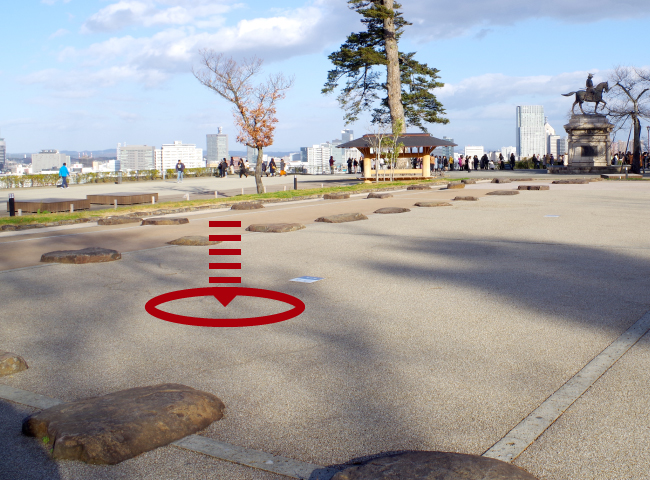 この付近はWi-Fiの電波が弱いため、騎馬像の北東側にある説明板付近であらかじめ画像をダウンロードしてから、現地VR体験スポットでご覧ください